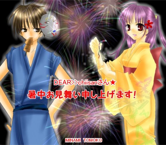 作:南友胡さん 友胡さんから暑中お見舞いいただきました。 名前まで入れていただけて!うーれーしーいー! 焼きイカとか、ちょっと怪しいお面とか、線香花火とか、こんなお祭りグッズ、私も欲しくなりました。 バックの花火で雰囲気もりあがりですね〜。 幼馴染同士っぽいこの二人の関係がちょっと気になるところ(笑) 楽しい暑中お見舞いどうもありがとうございました! 戻る