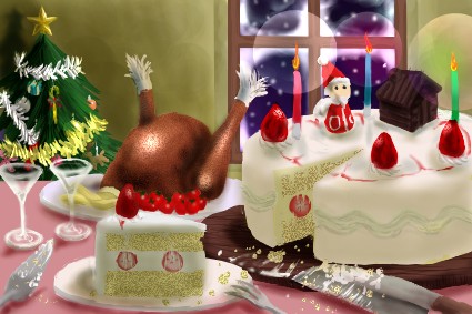 ですが、今回初めて鳥の丸焼きはクリスマス用品のカタログを見て描きました。